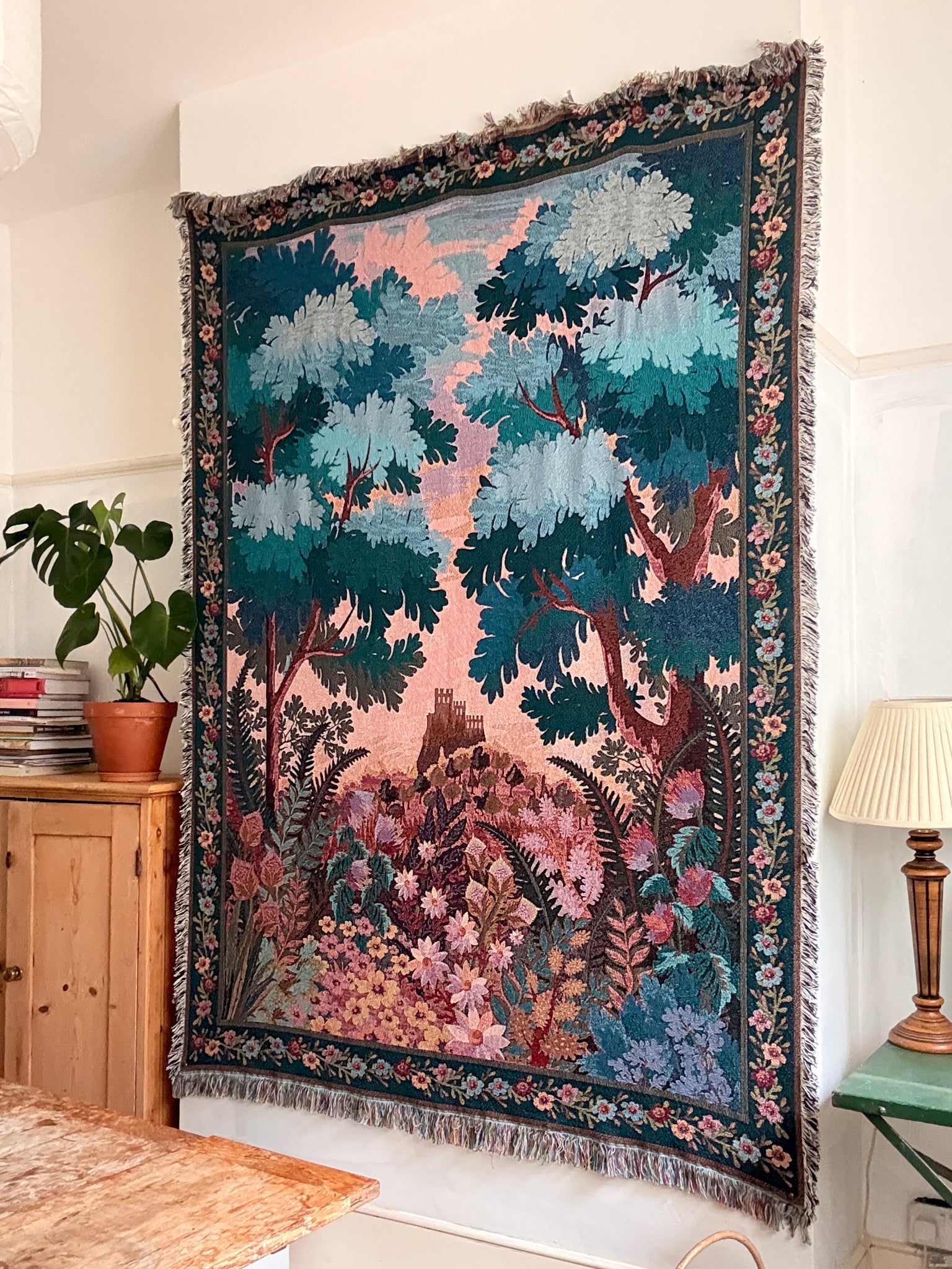 A nod to fine, antique, French Aubusson tapestries - a true heirloom piece. Perfect for the end of the bed, over shoulders, palatial picnics - or give your wall a romantic view. See the Zoom image for colour.