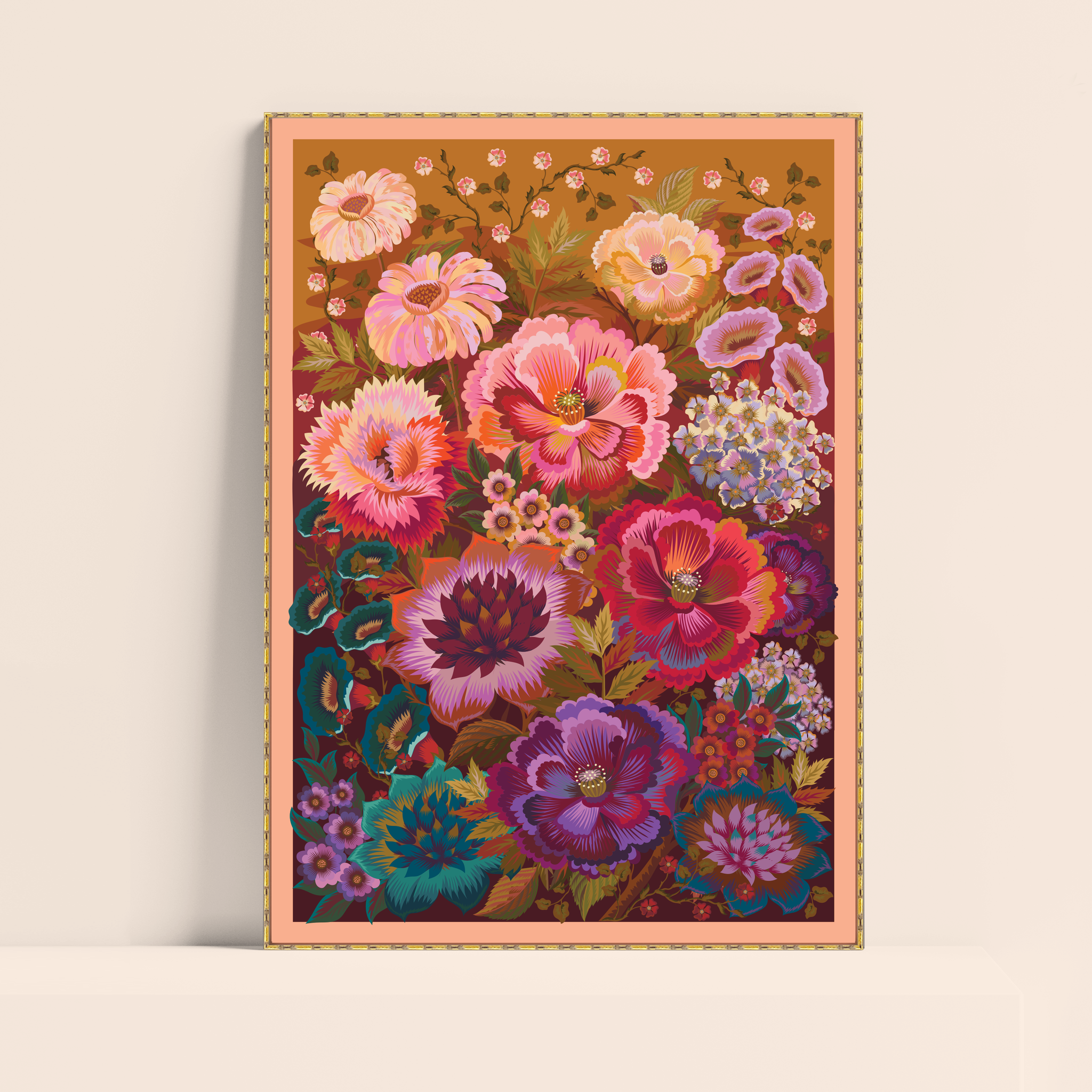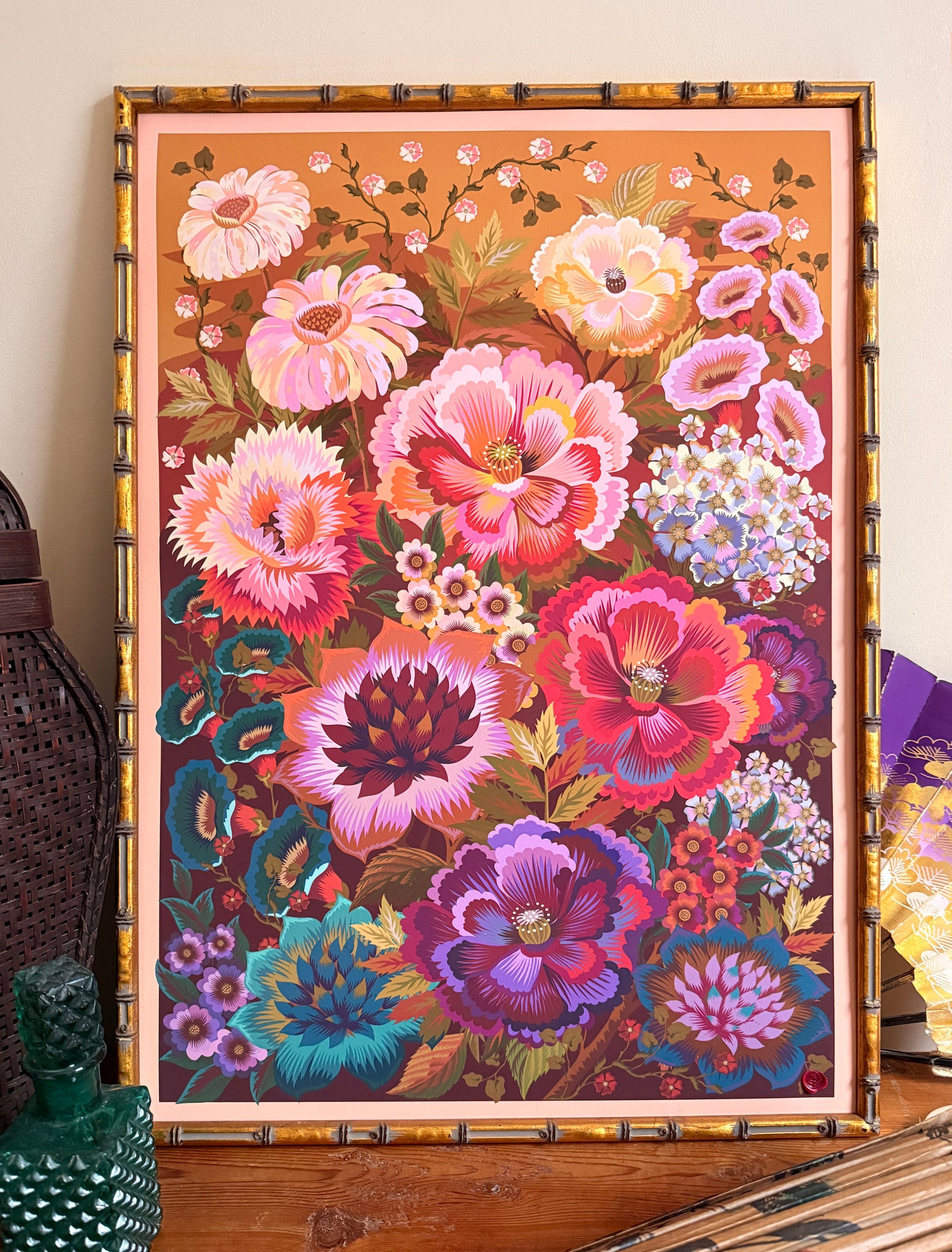 Rising from the dark to the light - this warm and softly blooming garden view is a sunset romance between rich earthy tones, petrol shadows and puff pink petals. Lots of small hidden hearts within (and Derek the tiny punk iguana of course...)